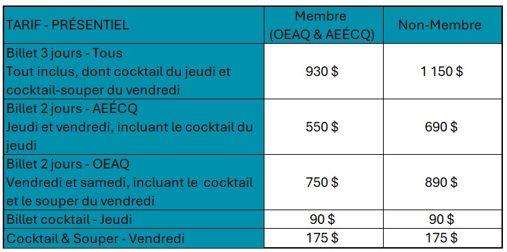 Les conférences de l’événement pourront certainement intéresser tous les participants. Celles du jeudi sont spécialement programmées pour les membres de l’AEÉCQ, celles du samedi pour les membres de l’OEAQ et le vendredi regroupe les champs d’intérêts communs;